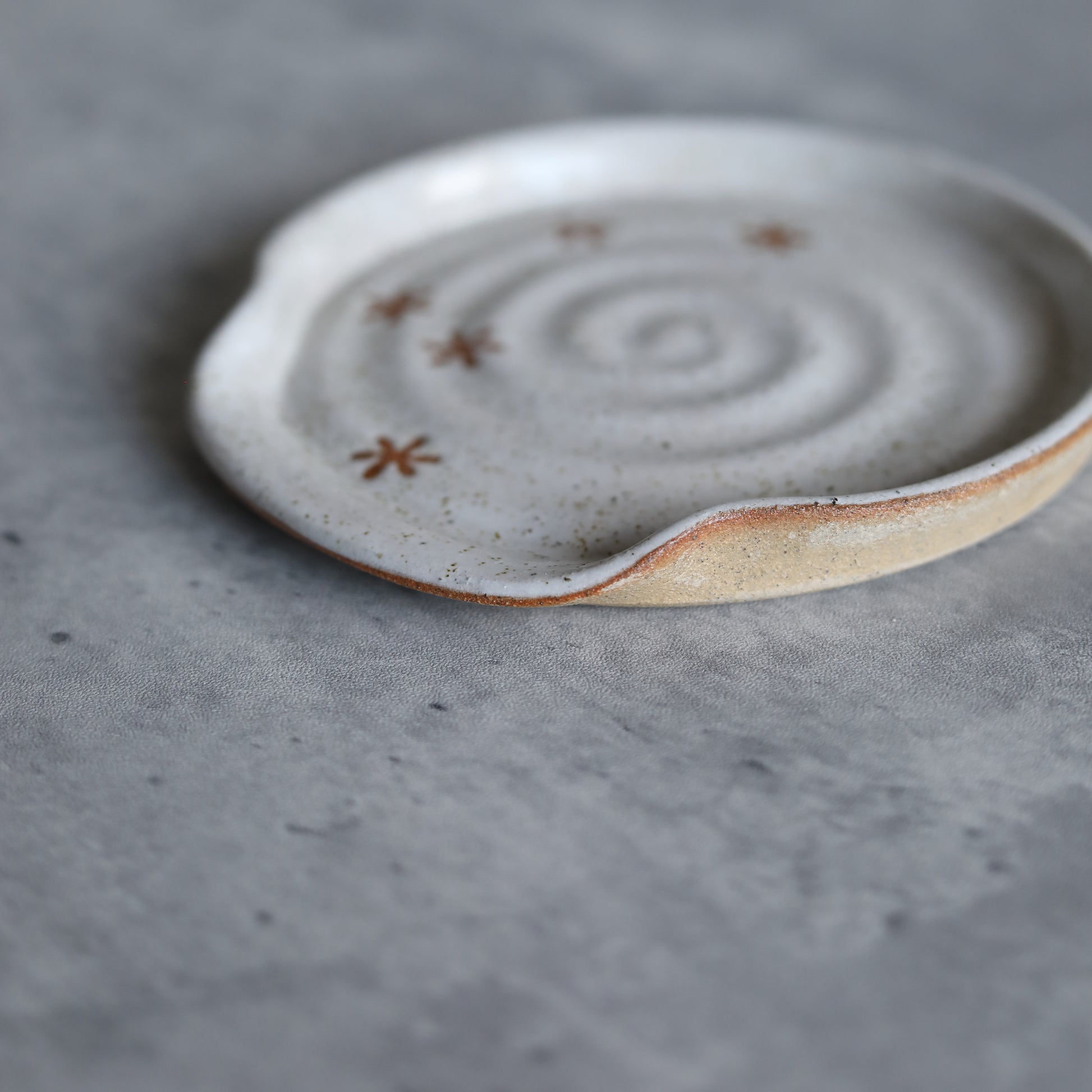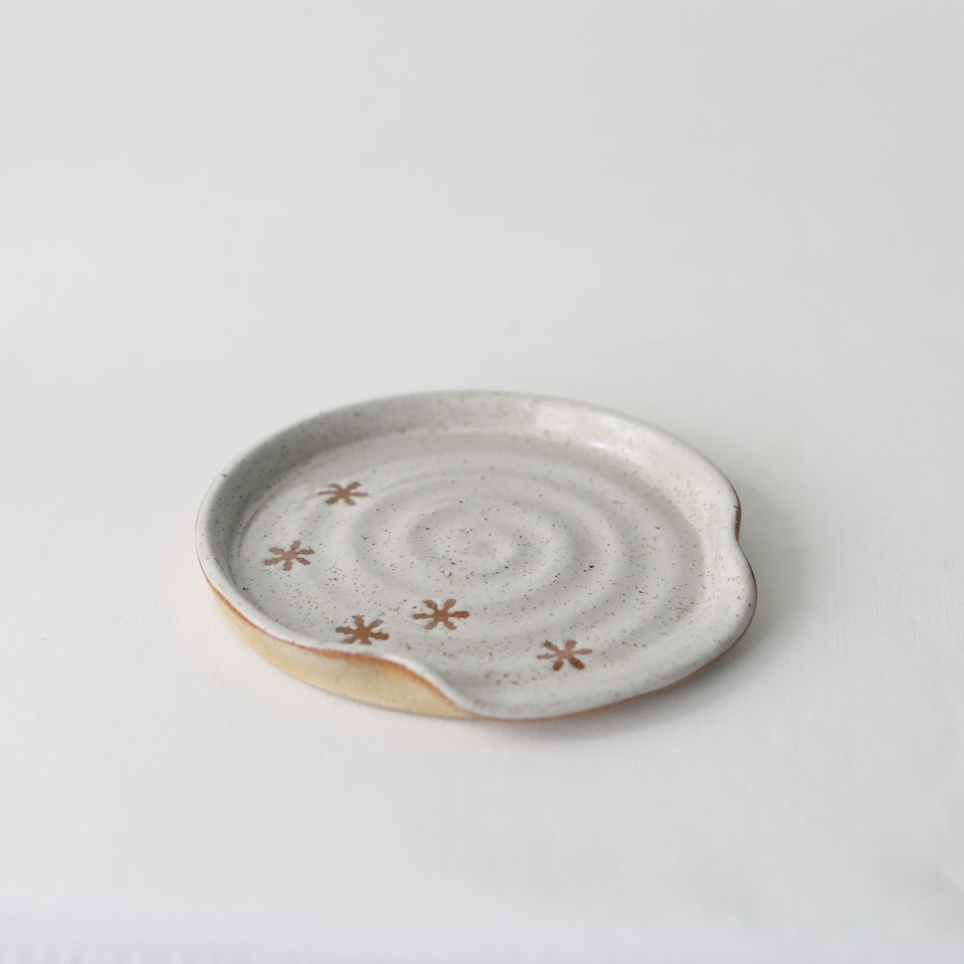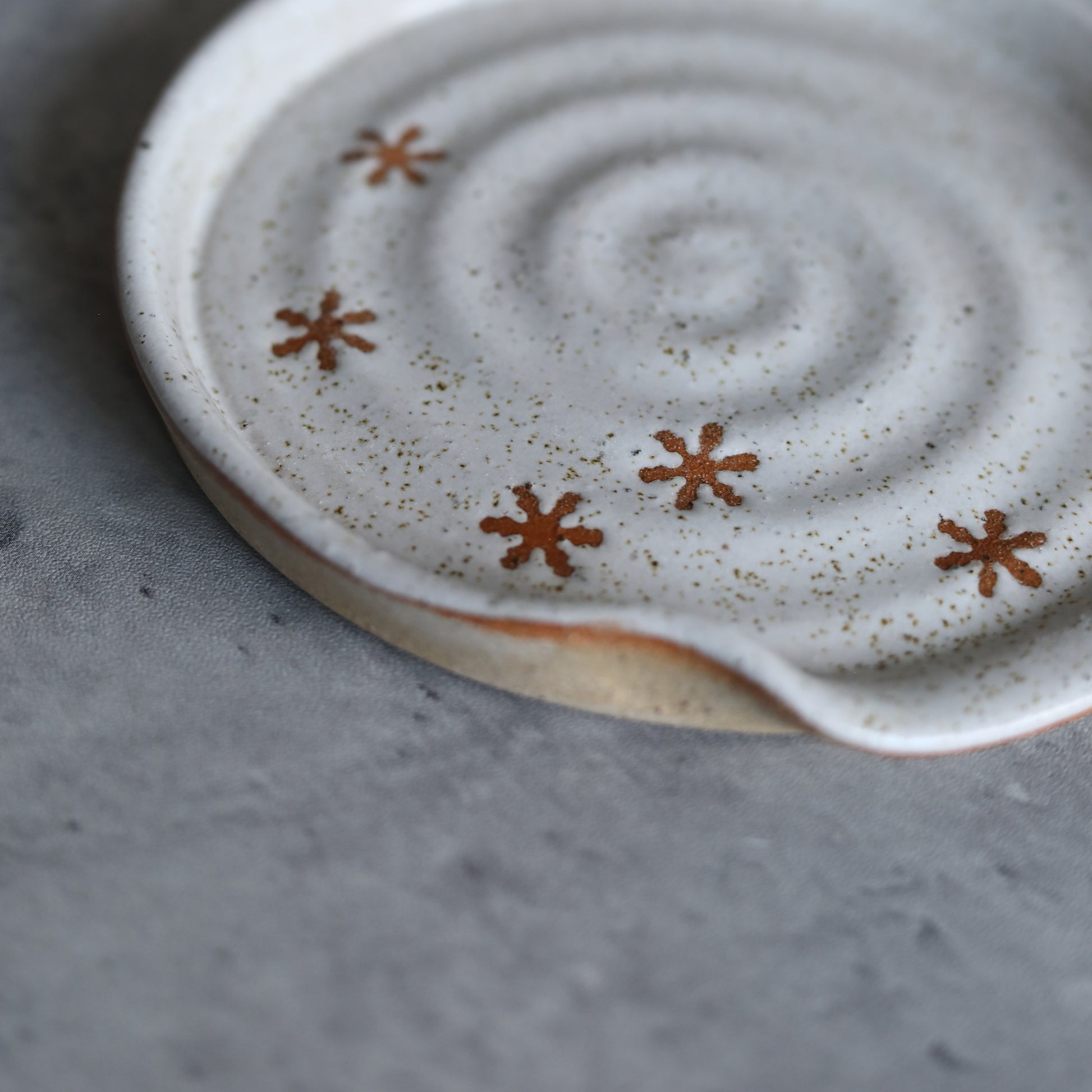Our pepper white handmade spoon rest features a glossy white glaze with a speckled finish and a snowflake design that highlights the natural toasted clay.
