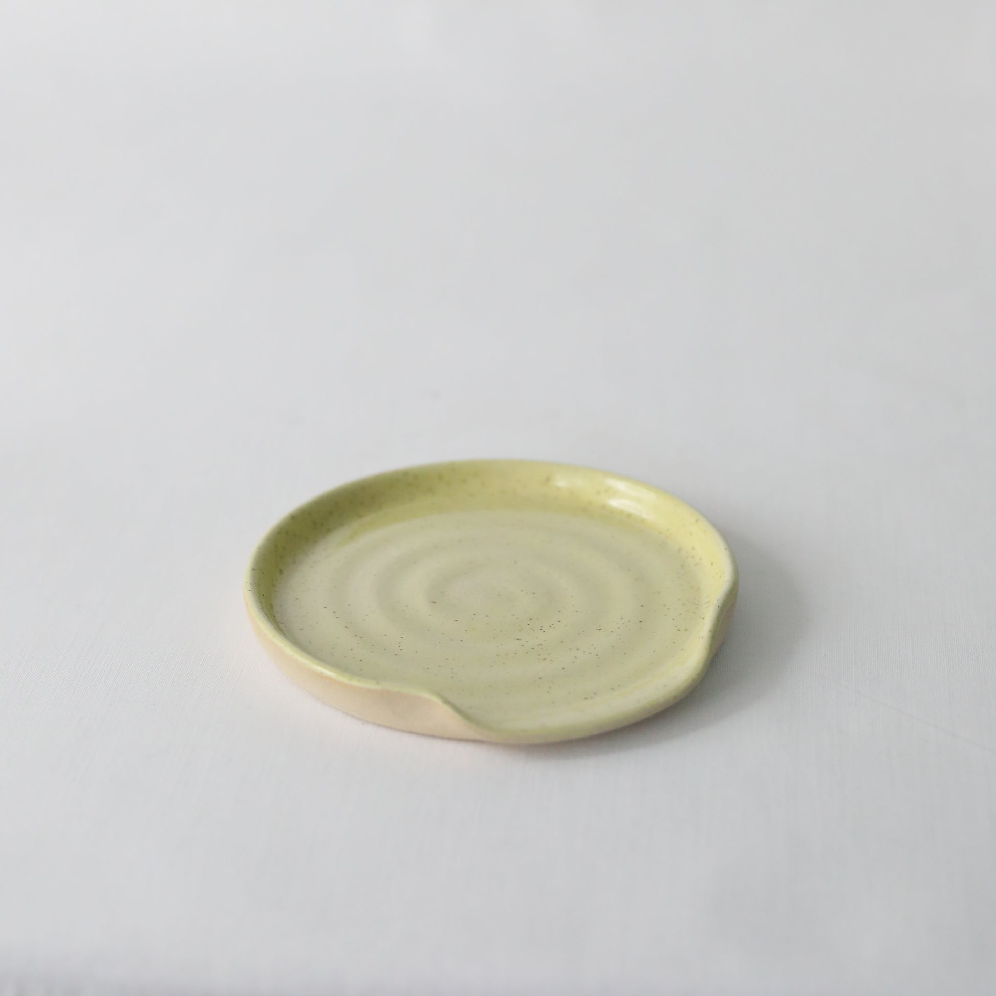 Our speckled corn handmade spoon rest features a glossy, yellow speckled glaze.
